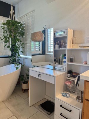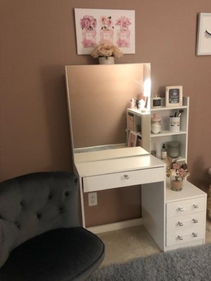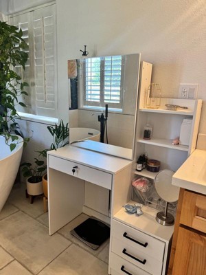 [This review was collected as part of a promotion.] I've had a vanity now for several years and I love the flexibility it gives my morning routine. What I haven't had though is storage for all my products and devices. This has radically changed that! I love the storage behind the mirror and all the drawers... no more clutter!