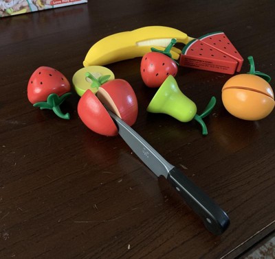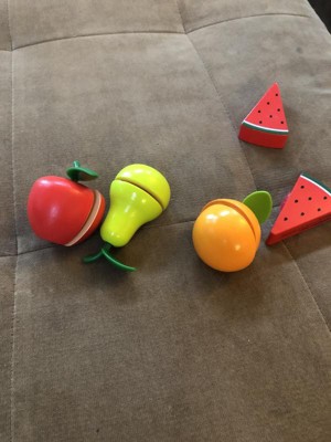[This review was collected as part of a promotion.] This is the perfect healthy fruit set. The set comes with a knife, two slices of watermelon, orange with stem, apple with stem, pear with stem, two strawberries with stems and a banana with a removable peel. The pieces are wooden with Velcro pieces that keep them together. My son loves that there are removable stems as he sees me when I remove the stems from the fruit before I prepare it for him. The fruit is sturdy and can easily be put back together. The banana is especially cool because it will teach him how to peel a banana from the peel! So much fun for hours!