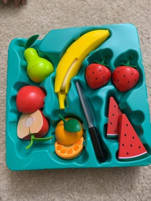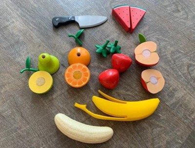 [This review was collected as part of a promotion.] My daughter loves cutting up her fruits with this adorable wooden play set. The pieces velcro together so she can use her wooden knife to cut them apart. The smaller fruits with stems can have the stems pulled out like your are prepping to eat them. The banana has the peel as silicon and the inside fruit piece comes out but cannot be chopped. She really loves playing with it in her little kitchen and on her high chair while we prep for dinner.