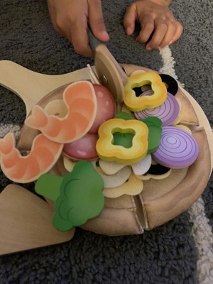 [This review was collected as part of a promotion.] We got our kids a play kitchen not long ago and have been getting different play food for them. This is a cool pizza set with a lot of different toppings but what's strange is that some of the toppings are durable wood and others are just fabric. The pizza slicer is really nice but the individual pizza slices are kind of disappointing when it comes to quality. You also need to cut off the tag because the tag on the pizza slice is almost as big as the slice itself.