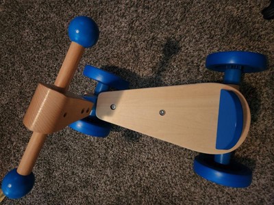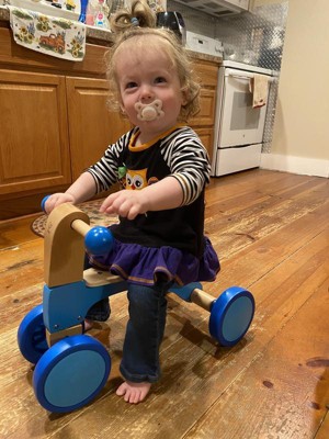 [This review was collected as part of a promotion.] This bike is absolutely adorable and made with quality wood. Besides being fun to ride I got to improve their balance and provide some exercise all in one. I like the four wheel design to help with balance so your toddler won't have the fear of falling. The wheels have a rubberized coating so they won't mark up your floors. I wanted to save for Christmas but couldn't resist seeing that happy face now. Some assembly required but very easy to assemble.