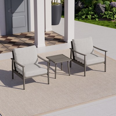 Crafted with fully waterproof aluminum and advanced anti-fade coating, this outdoor set features 275lb-capacity chairs with ergonomic 105° backrests. Includes thick breathable cushions with removable UV-protected covers and a versatile side table. Delivers lasting comfort with minimal maintenance for terraces, courtyards, and backyard relaxation.