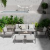 - 7-Piece Patio Conversation Set: The outdoor patio furniture set includes 1 Three-Seater Sofa, 1 Coffee Table, 1 Side Table, 2 Armchairs, and 2 Ottomans. The coffee table is convenient for keeping snacks, drinks, and books within reach, while the ottomans offer comfortable support for your feet and aid in muscle relaxation. Whether you want to enjoy the sunshine with a good book or unwind with a cold drink and a friend, this aluminum outdoor furniture set is the perfect choice.
