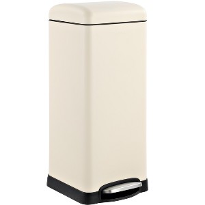 This semi-rectangular 8-gallon trash can hides plenty of capacity within its slim size, making it a great choice for home offices, craft rooms, laundry rooms and other small spaces. Featuring a profile hinge and retro silhouette -- its sleek design allows it to sit close to a wall or cabinet. Its design features don't end there -- it features a steel step-on mechanism that allows for smooth openings and closings (no pinched fingers!), and has a removable plastic liner that makes bag changes a cinch.