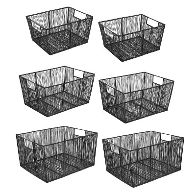 Organize a home office, bathroom or kitchen shelves with a vintage style set of nesting baskets. Set includes six baskets in three sizes that fit perfectly in a cabinet or on open shelving. Durable design features metal wires and an open look for an industrial look in any space