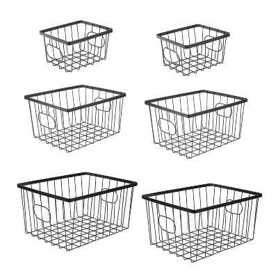 Organize a home office, bathroom or kitchen shelves with a vintage style set of nesting baskets. Set includes six baskets in three sizes that fit perfectly in a cabinet or on open shelving. Durable design features metal wires and an open look for an industrial look in any space