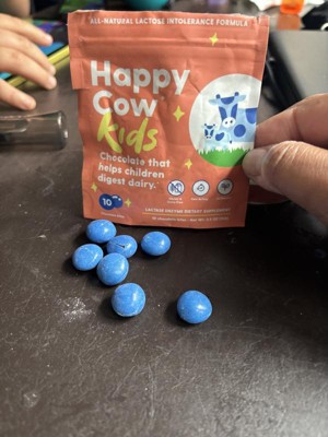 My 2 year old is lactose intolerant and LOVES these. The chocolates look like m&ms so my daughter thinks she is getting a special treat! We love that it’s easy for her to take vs a pill. It’s also very easy to travel on the go, with! We love Happy Cow pills!
