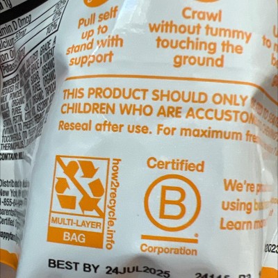 A snack suitable for all my kids, but a favorite for my 11 month old. The texture is smooth and easily melts in your mouth. The mango taste is perfect and is our favorite flavor. Easy packaging to take anywhere and love how it is resealable.