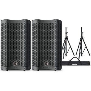 The Harbinger VARI V2408 8" powered speakers package contains two VARI V2408 8" loudspeaker, plus stands.Harbinger VARI V2408 8" LoudspeakerThe VARI Live V2408 powered speaker delivers a wide frequency spectrum with exceptional detail and signal dispersion that can fill small- to medium-sized spaces. The V2408’s onboard Class-D amplifier unleashes 100 watts of RMS power (400W peak power) through an 8" low-frequency driver and a 1" tweeter. However, the V2408 isn’t just a speaker as it includes a built-in mixer, selectable voicing (transform from a main speaker to a monitor or link up to an external subwoofer), Bluetooth playback and even a charge jack to power up mobile devices. A single Harbinger VARI Live V2408 is an ideal and highly portable system for singer-songwriters. The onboard mixer can manage up to five simultaneous sources, which means a solo performer can plug in a guitar or keyboard and a vocal mic, as well as deploy Bluetooth or laptop to play ancillary backing tracks. It’s not a problem if need more inputs for a bigger group, a solo gig that requires several instruments or a multi-faceted DJ rig. Simply incorporate an external mixer by using the V2408’s balanced stereo inputs.Proline Speaker StandsThe Proline SPS502 speaker stand 2-pack with carrying bag is the ideal way to elevate PA speakers for live performances or presentations. This heavy-duty speaker stand set includes two telescoping tripod stands constructed of rugged steel tubing able to support speakers up to 120 pounds each. Whether 're gigging across town or touring the country, the Proline SPS502 Speaker Stands are ready for the journey. The tripod bases provide maximum stability on any surface while still collapsing for compact storage in the included carrying bag. Rubber feet prevent slipping and protect floors, and the locking knobs securely fasten the inner and outer tubes at desired height. These road-ready stands can handle the demands of frequent setup, takedown and transit without sacrificing an ounce of strength or dependability.