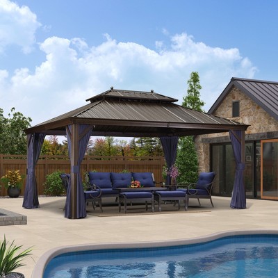 Hardtop Gazebo 10'x13', with Double Polycarbonate Roof, Aluminum Alloy Frame, Net, and Curtain, Permanent Building, Gray