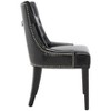 The stylish Harlow ring chair by Safavieh transforms any dining room with instant glamour. Dressed up with silver nail heads and a clever metal ring on its back, Harlow is shown in black bicast leather with birch legs in espresso. Button tufts on the front of the tapered backrest add to the allure of this set of two chairs.
