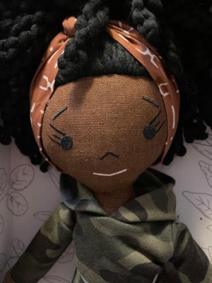 [This review was collected as part of a promotion.] This doll is too cute! Its made really well soft body doll. She has on a cute camo jogging suite and the cutest little converse like tennis shoes! I love her hair! I'm glad they are finally making dolls our kids can see they look like them!! Great idea! My girl is gonna love this! Highly recommend!!