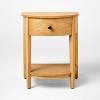 Enhance the look and functionality of your bedroom with this Harriett Nightstand from Threshold™ designed with Studio McGee. Supported by a wooden frame, this nightstand is designed in a half-moon shape for an elegant look. It features a wooden tabletop to place lamps and vases, a drawer to store your essentials, and a lower shelf to keep books, magazines and other items. Plus, the natural wooden brown tone makes it versatile to match a variety of decor schemes.