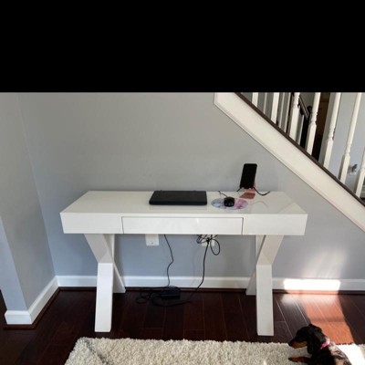 Love this little desk. Sleek, stylish and sturdy for a laptop and stack of papers. Not super big, yet great for small space. Would also work as console. VERY EASY to assemble...simply attach legs with included screws. Drawer already installed. Couldn't be happier.