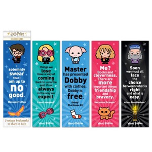 Muggles and wizards alike will love this pack of five Wizarding World bookmarks! Each Harry Potter themed bookmark has a unique look and an inspiring quote to match. Keep them all or share with your friends. Characters featured in this pack are: Harry Potter, Luna Lovegood, Dobby The House Elf, Hermione Granger and Albus Dumbledore.