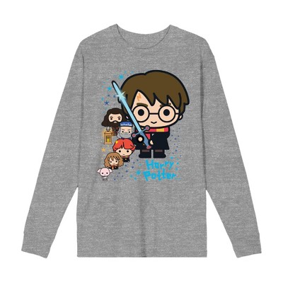 Elevate your Harry Potter fandom with this men's navy heather short sleeve crew neck t-shirt. Featuring a chibi image of Harry wielding a glowing sword, surrounded by beloved characters Hagrid, Dumbledore, Ron, Hermione, and Dobby, this shirt brings the magic to life. The blue letters spell out Harry's name, infusing your outfit with enchantment. Crafted from a blend of cotton and polyester, this shirt ensures comfort and durability. Whether you're at home or out and about, let your passion for the wizarding world shine with this graphic tee.