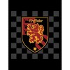GRAPHIC TEE: This boy's shirt features a red and black shield with a red griffin outlined in gold, forming the crest for the House of Gryffindor. The shield is set against a black and white checkered board.