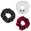 A: The set includes a black scrunchie with HP and Snitch logo, a burgundy velvet, and a Hedwig character design.