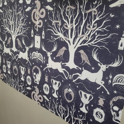 Embrace the wonder of Harry Potter™ while adding a touch of elegance and wizarding whimsy to your home with this officially licensed Harry Potter Horcrux Damask peel and stick wallpaper. Featuring a forest scene with the silhouettes of Patronuses, the Whomping Willow™ , and the 7 Horcruxes, this damask print is the perfect backdrop for any Harry Potter lover’s space, and installs in just Peel, Stick…Done!® Harry Potter Horcrux Damask Black Peel and Stick Wallpaper comes on one roll that measures 20.5 inches wide by 18 feet long.