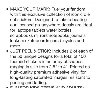 - MAKE YOUR MARK: Fuel your fandom with this exclusive collection of iconic die cut stickers. Designed to take a beating our licensed go-anywhere decals are ideal for laptops tablets water bottles scrapbooks mirrors notebooks journals lockers skateboards cars bicycles and more.