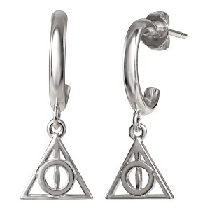 - Magical silver jewelry for fans of Harry Potter. These small hoop earrings boast a dangle charm of the Deathly Hallows symbol
