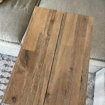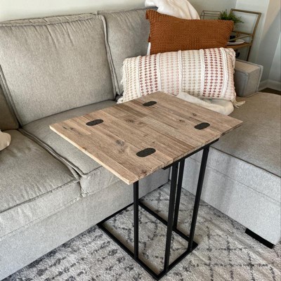 Convenience is key with this charming rustic side table and this versatile piece will be a nice addition to your living room design. This accent table can be used next to your sofa as its C shape will fit over chair arms or couch cushions. Its natural wood color tabletop and black metal legs will coordinate beautifully with the modern farmhouse, contemporary or casual style of your living room. If you need a side table to place your beverage, book or reading lamp, this rustic end table is the perfect option. Even better, if you occasionally need a larger table next to your sofa, the tabletop has an expandable folding leaf for extra space. The C shape design allows the table to slide easily over your sofa and if you need more space in your living room, this table can easily fit into small spaces and be stowed away.