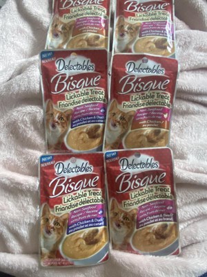 Delectables Savory Broths Lickable Treat has a unique wet texture that combines real tuna & salmon with a rich and savory broth, even the most finicky cats will be begging for more! This nutritious and hydrating new wet cat treat entangles the fish and the sauce together so your cat can lick up both the sauce AND the fish, without leaving any fish behind. These versatile lickable cat treats can be used as a food topper, a quick snack, or a special treat – all these uses will have your cat loving you back! This pack includes twelve (12) 1.4-ounce single serving pouches of pure kitty satisfaction. Try our other Savory Broths recipes in a variety of flavors, Non-Seafood, or Senior 10+, but why stop there? Delectables Lickable Treats are available in a Stew, Bisque, Chowder & Soft Pate texture in a wide variety of flavors for each and every kitty!