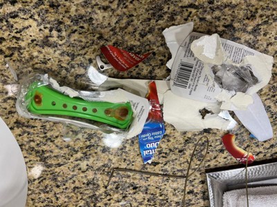Bought a couple of these for a trip this weekend. Late at night in hotel late dog got restless and barking. Got one out to give him and he starts barking. Don’t travel with a chain saw and could not open it with anything we had. Eventually poked through plastic but you MUST remove all plastic to get it out. Took probably 10 minutes and broke knitting needles to try to get it out. Plastic does not tear, no perforation or tab to open. Dog barking whole time at midnight. If I had hand use issues I would be out of luck Horrible