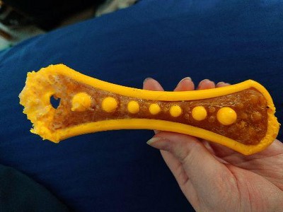 i have bought these for years for my little dogs (shih tzus) and they have gotten hours of fun wrestling with them to get the insides out! But recently i bought a two pack and the bacon insides fell right out whole! i don't know if it is a manufacturer problem but they have tiny teeth and mouths and that has never happened before and i have bought these many times prior. i had to throw it out as i wasn't sure it would get swallowed whole and i didn't want the dogs to choke. So overall really really good product just a little disappointed with the latest purchase!