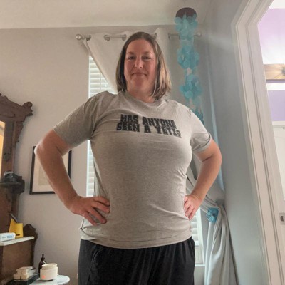 [This review was collected as part of a promotion.] This is a super fun shirt. It is soft and a nice thickness. I am 5’10” and weigh 230. I usually order a large or extra large. I ordered a large. It is a more snug fit. It does fit and is very comfortable. It’s easy to flip up for the joke and to get some laughs. It’s a nice quality and will wash up well.