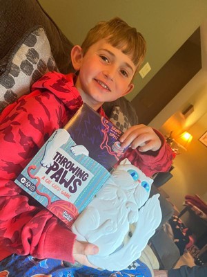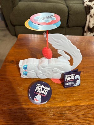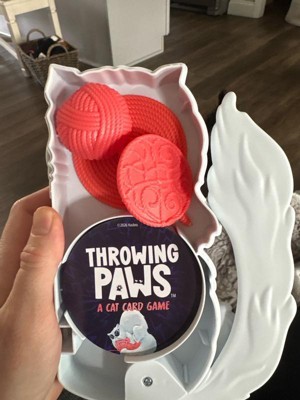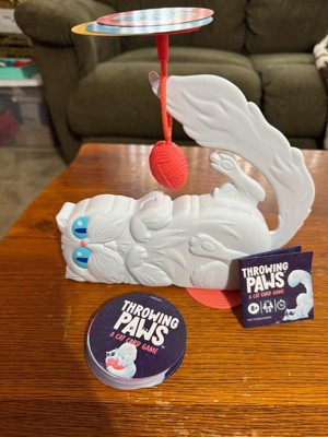[This review was collected as part of a promotion.] Throwing paws is a fast paced silly and easily understandable game. My kids and I played and they are 8 and 6 and caught on quick. It requires some strategy. You stack cards on the wobbly yarn and hope it doesn’t fall! Awesome little game with a cute storage cat box.