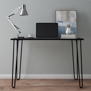 Bring modern style to your home with the Hairpin Leg Desks by Lavish Home. The clean lines of this of table bring a chic, updated mid-century modern office décor to your home. The gaming desk is constructed from a sturdy manufactured wood material and powder-coated steel tapered hairpin style legs that have rubber foot pads to protect your floors from damage. This easy to assemble laptop table takes up a minimal footprint, ideal for small homes, apartments, or dorms.