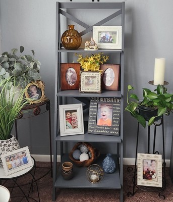 The 4-Shelf Ladder Bookshelf by Hastings Home is a perfect decorating and storage solution for your living room, bathroom, bedroom, office, or kitchen. This freestanding shelving unit is the perfect platform for displaying books, knick-knacks, photo frames, or other home decor. Constructed of gray painted manufactured wood, this stylish bookcase features a straight back with cross braces for added stability when placed against a wall and a descending angled design for a space-saving footprint in any room, big or small.