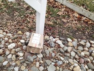 Hatch box was smashed, FedEx and Target delivery box was smashed and left on wet rocks by curb and not on doorstep