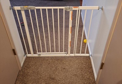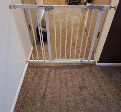 [This review was collected as part of a promotion.] I love having this gate installed in my house. We use it in the hallway entrance to keep our baby in the living room. It does the job and works great. It is really easy to install and is the perfect fit. It's easy to open it up also but a baby or a toddler will definitely have hard time getting it to budge. My son tries to shake it really hard but he fails to move it at all. It's staying in place until moved.