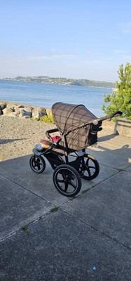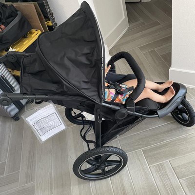 Whether it's a trip to the mall, beach, or a gravel trail, the large pneumatic wheels and lockable front wheel will provide safety, stability, and an easy ride. Go out under the sun with the stroller's built-in canopy, rated UPF 50+, that can be opened, showing a large mesh area that allows optimum air circulation and eye contact with your child.