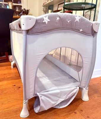 [This review was collected as part of a promotion.] I received this item in exchange for my honest review. I am impressed with the size of this cot and the structure feels very secure and well made. I also love the color and the gender-neutral stars. I don’t actually love the zipper on the outside because I have toddlers that want to get into the cot and mess with the zipper. I also don’t love that the cot needs some sort of cushion because it is not a cozy napper for a child traveling.