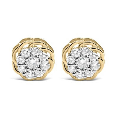 These magnificent .2 carat diamond earrings are crafted in stunning yellow plated sterling silver. Each earring features a cluster of 7 brilliant-cut diamonds, of I-J color and I3-promo clarity, that form beautiful flowers. Show her how much she means to you with these dazzling diamond earrings.