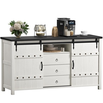 This modern farmhouse-style sideboard combines functionality with a rustic aesthetic, available in two sizes (48" and 60") and colors (brown and white). With 2 sliding barn doors, 3 drawers, and a spacious tabletop, it offers versatile storage for kitchen essentials, living rooms, or dining areas.