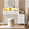 Discover the Hausource multi-functional vanity table, designed for modern style and everyday convenience. Featuring a sturdy metal frame, waterproof wood top, and five spacious drawers, it combines durability with elegance. A built-in charging station with AC, USB, and Type-C ports keeps devices powered, while its versatile design doubles as a nightstand or dressing desk for any room.