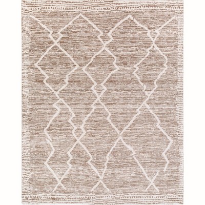 A: The rug features a classic Moroccan farmhouse style with a modern trellis pattern.