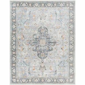 A: The area rug features styles such as farmhouse, traditional, medallion, and traditional floral.