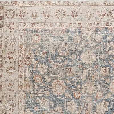 A: The rug features a traditional style with a sophisticated damask pattern, adding elegance to any room.
