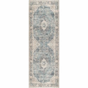 Brand: Hauteloom < br / > Collection: Nayef < br / > Colors: Ice Blue, Blue, Cream < br / > Style: Traditional < br / > Size: 2'7" x 7'3" < br / > Shape: Runner < br / > Material: Face: 100% Polyester < br / > Construction: Machine Woven < br / > Roomtype: Hallway, Kitchen < br / > Pile: Medium Pile < br / > Made in: Turkey < br / >