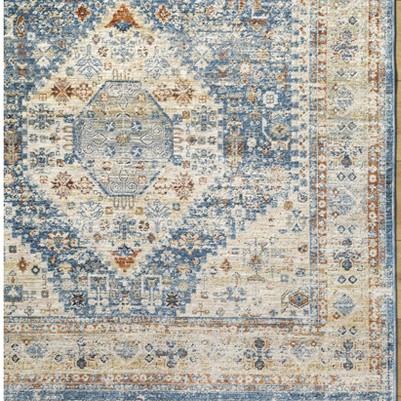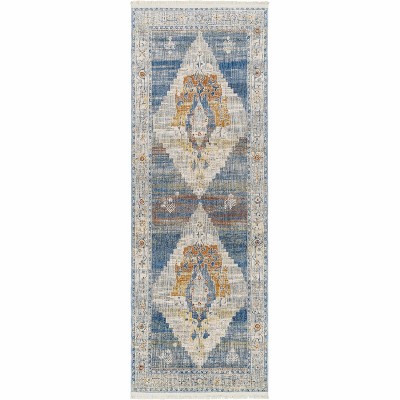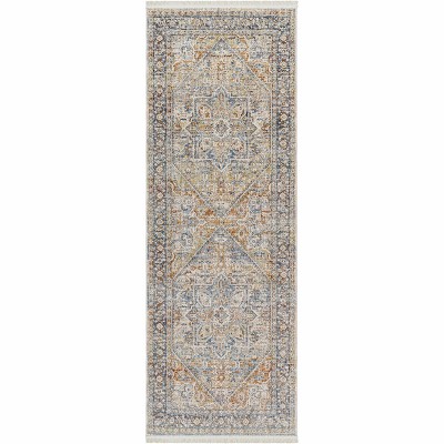 Collection:CyndiColors:Blue, Mustard, Beige, Burnt OrangeConstruction:Machine WovenMaterial:100% PolyesterPile:Low PilePile Height:0.16"Styles:TraditionalMade In:TurkeyThickness:0.22"Fringe Length:0.6"