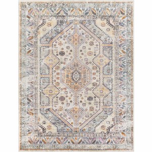 A: The rug features a vibrant mix of colors including charcoal, purple, yellow, burnt orange, light blue, and light sage.
