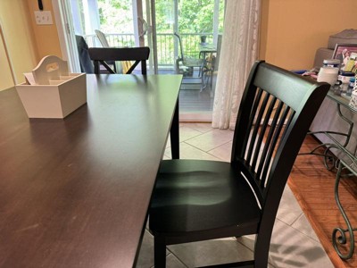Very nice table. Solid Wood. Easy assembly. You just have to attach the legs. Seems sturdy. The chairs are from Temu. Search 2pcs Rural Farmhouse Wooden Chairs with Padded Dining Chairs, Velvet Cushioned Backrest Kitchen Chairs, Suitable for Restaurants/ kitchens. They shipped from a local business and are currently a set of 2 chairs for eighty dollars. When I purchased the table it was on sale for ninety nine dollars.