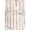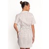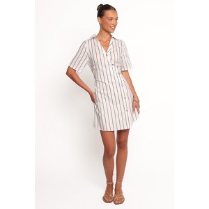 • A: The dress features a pinstripe design with a collared neckline and shell button details.