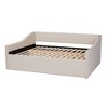 Embrace midday naps and restful nights of sleep with the Haylie daybed. This wood daybed is upholstered in a soft, resilient polyester fabric and is padded with foam for the utmost comfort. Button tufting lends a classic look, while silver nailheads highlight the elegant curves on the side panels. Add some throw pillows to create a cozy hangout during the day, then, at night, switch out the pillows for a plush duvet to sleep the night away. The Haylie daybed is made in Malaysia and requires assembly. Recommend queen size mattress for this item. Mattress fit dimensions: 6" High x 60.6" Wide x 80.3" Deep