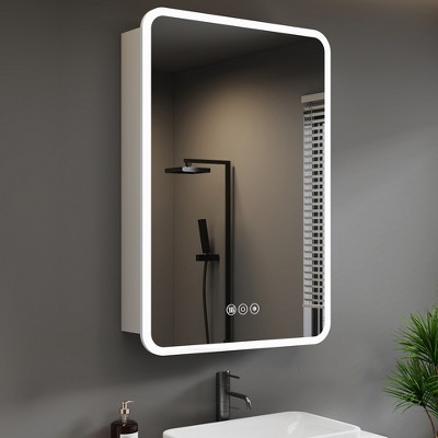 HBEZON Medicine Cabinet with Mirrors and Lights, 20'' x 26'' Wall Mount LED Bathroom Cabinet, Defogger, Dimmable, Clock, Temp, Aluminum, Silver